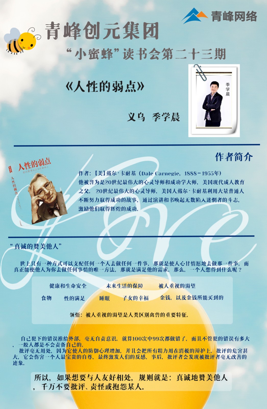 【青峰創(chuàng)元集團】“小蜜蜂”讀書會第23期《人性的弱點》-- 季學晨分享