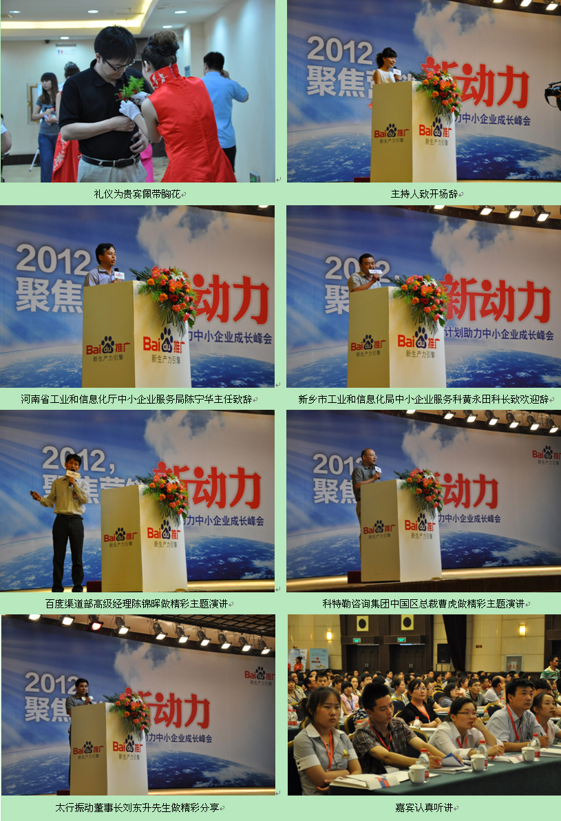 2012年5月29日,“2012,聚焦營銷新動力-百度翔計劃助力中小企業成長峰會”來到了有著豫北明珠之稱的新鄉,奮發有為、與時俱進的新鄉市中小企業家早已經是迫不急待的迎接這一天的到來。