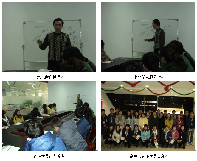2011年12月17日上午10點,新鄉(xiāng)青峰網(wǎng)絡(luò)第三期轉(zhuǎn)正培訓(xùn)如期舉行,青峰網(wǎng)絡(luò)總經(jīng)理余進先生親自為轉(zhuǎn)正的新人做培訓(xùn),所有參訓(xùn)人員備受鼓舞。