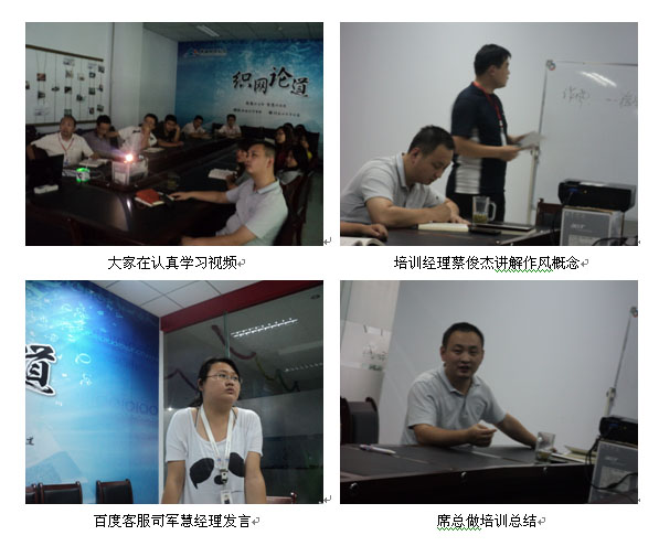 會議開始,大家一起學習第十屆中國互聯網大會《王利芬對話互聯網四大佬》視頻,了解互聯網的未來趨勢,馬化騰,丁磊,李開復,曹國偉分別談自己對互聯網未來發展的看法。隨后,培訓經理蔡俊杰帶領大家一起學習《作風就是戰斗力》,一起討論大家眼中的作風是什么樣子的,結合自己的工作談談團隊應該具有什么樣的作風,運營副總裁席瑞宏先生做最后總結。最后,企管總監吳學泓為大家講解《業務經理人力資源管理培訓》(選人篇),主要講解作為部門經理,在人力資源中的作用和責任,在招聘新人的過程中要注意哪些問題,面試的內容,面試的注意事項等。