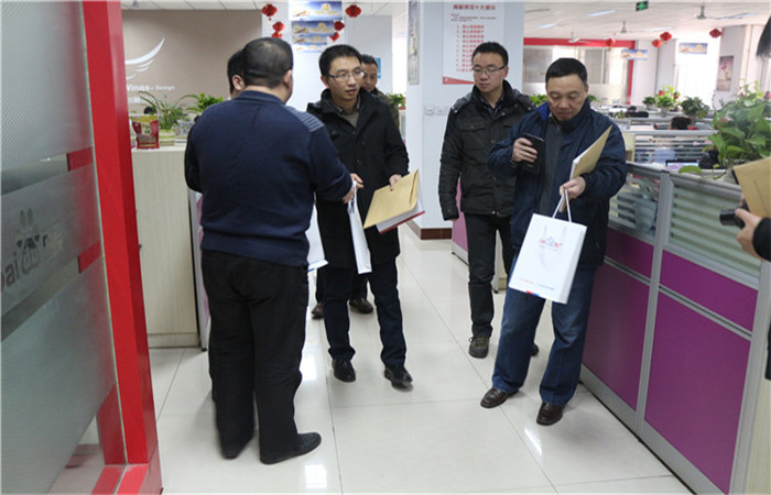 1月14日上午,河南省電子商務示范企業評審組領導一行蒞臨河南青峰網絡科技有限公司視察指導,河南青峰總經理岳振寧先生、企管部總監王艷女士、行政部高級經理付士奇先生隨行陪同。公司為每位到場的領導送上了公司的宣傳資料,讓領導對公司有了大致的了解。